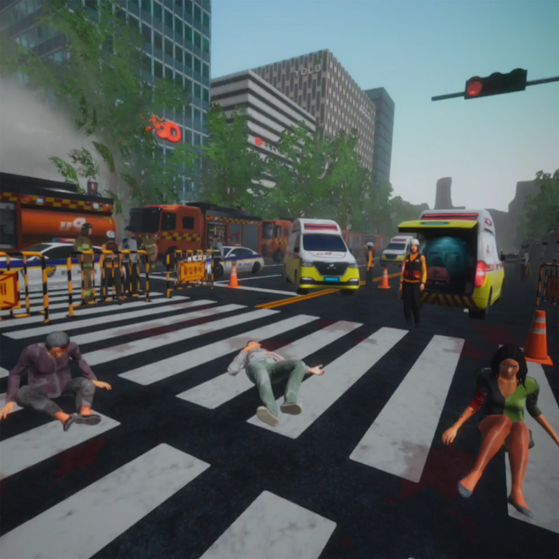 - 간호실습에 참여하는 실습자는 가상의 재난 현장에서 응급 환자들을 대상으로 환자 분류 및 응급 조치 훈련을 수행합니다.