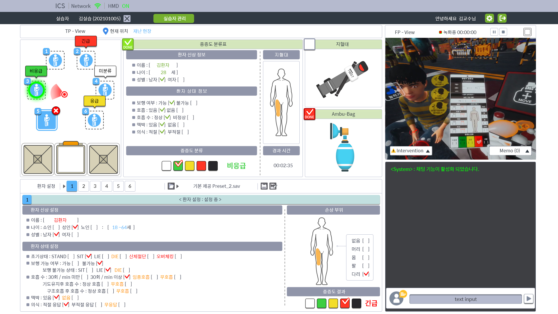 - 실습자는 환자의 상태를 살피고 응급처치를 시행한 후, 긴급도에 따라 중증도 분류표를 부여하는 실습을 수행합니다.
